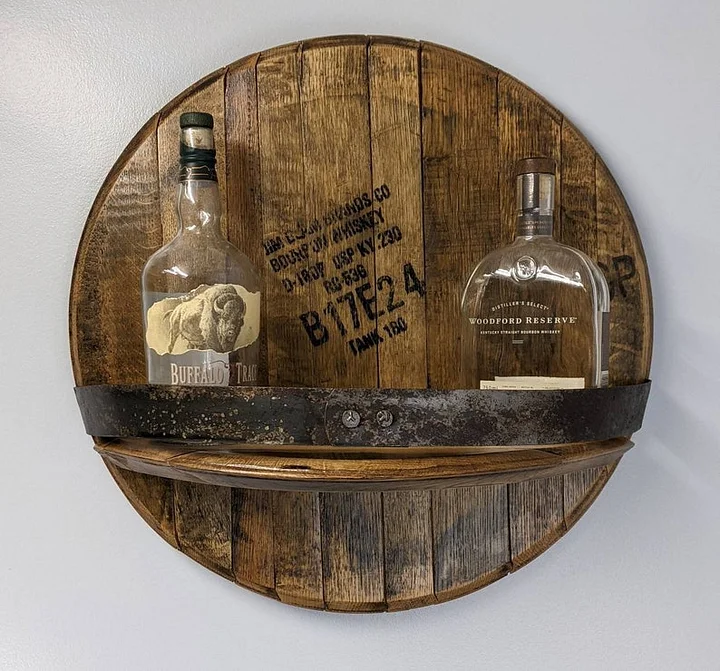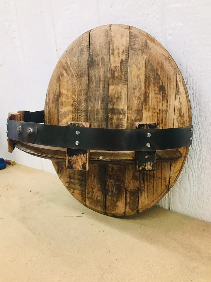 I clean all the tops then sand them just enough to smooth them out. I want my tops to be rustic but we’ll finished. I then seal them with three coats of lacquer. The shelf part is made from part of another top. I clean all the rust off, then seal it with 3 coats of lacquer. These bands may be dented or bent. I do straighten them out as much as I can but they are reclaimed.Display your bourbon or whiskey collection on this shelf made from whisky bourbon barrel heads, staves and the metal bands used to secure the bourbon barrels. The shelf is finished in polyurethane to accent the beauty of the barrel oak. The shelf will hold approximately 5 bottles depending on how they’re placed.