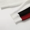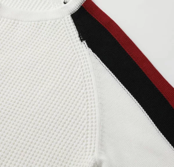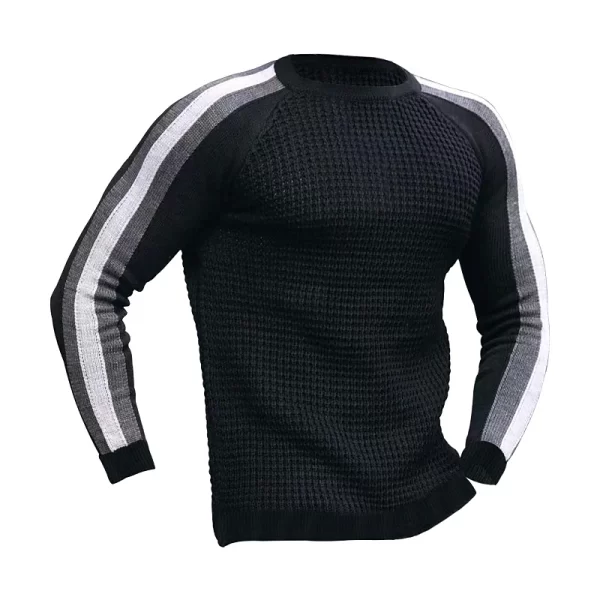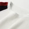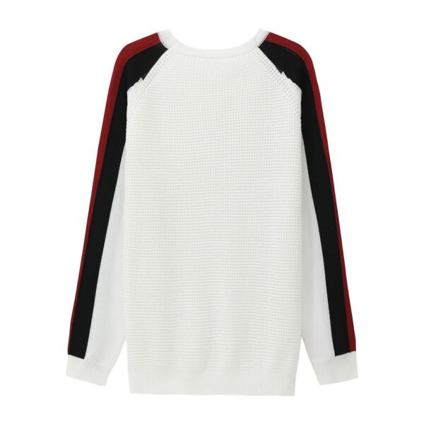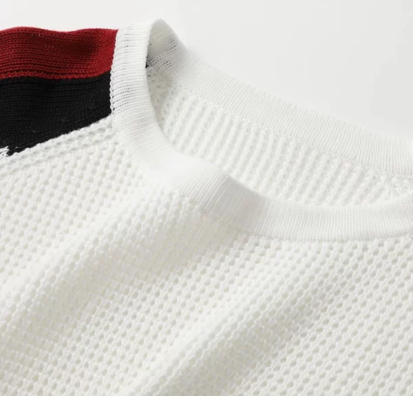 The cropped length introduces a confident, fashion-forward silhouette, balancing clean lines with a relaxed sensibility. A classic crew neckline grounds the design, while long raglan sleeves enhance mobility and lend a subtle athletic influence. The waffle-knit construction adds depth and dimension, complemented by understated stripe detailing for a modern visual rhythm.