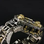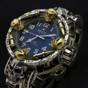 ☠ Men’s Wrist Watch handcrafted with golden skull detail. This Wrist Watch is super bold, chunky, heavy metal and totally badass, it’s an unmistakable statement piece of wearable art.
