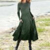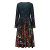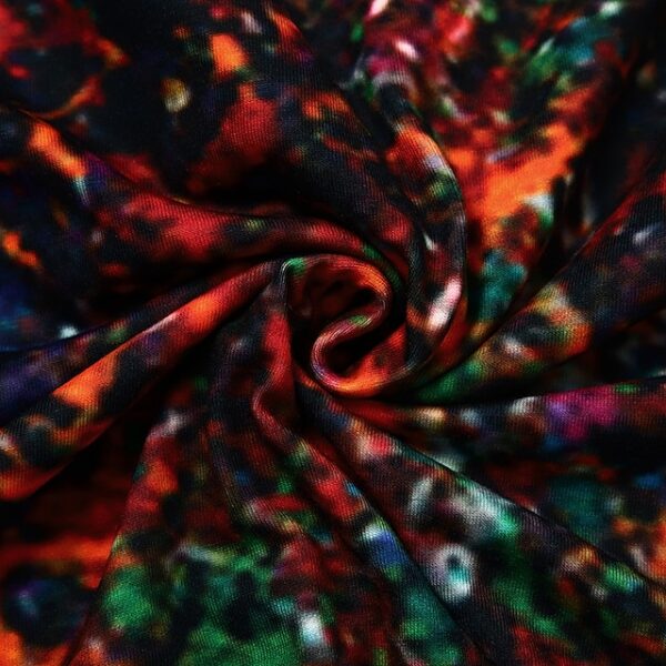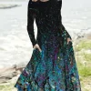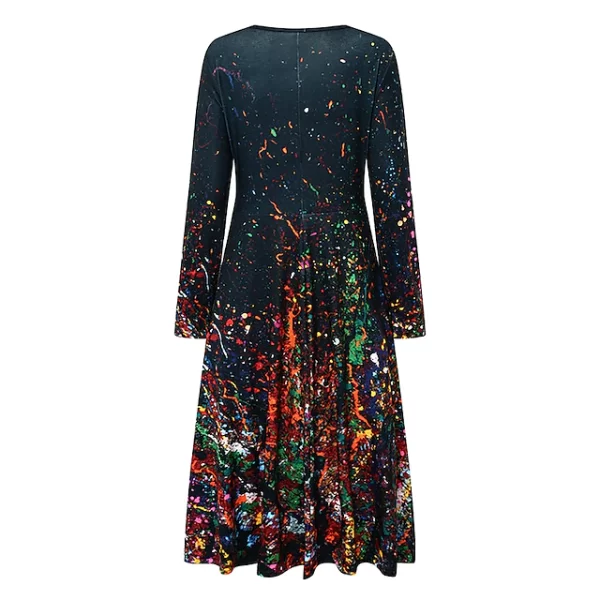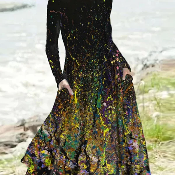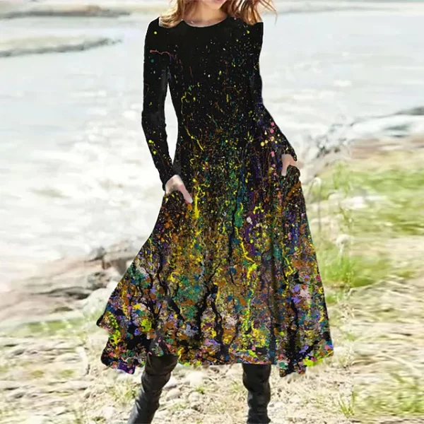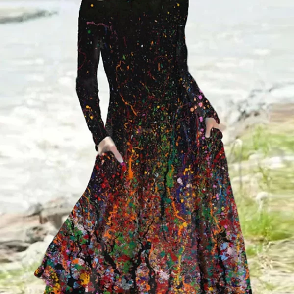A rich color gradient inspired by modern tie-dye artistry brings depth and individuality to the design. Long sleeves provide graceful coverage, while the classic crew neckline adds balance and versatility. Discreetly integrated side pockets enhance functionality without interrupting the clean lines of the dress.